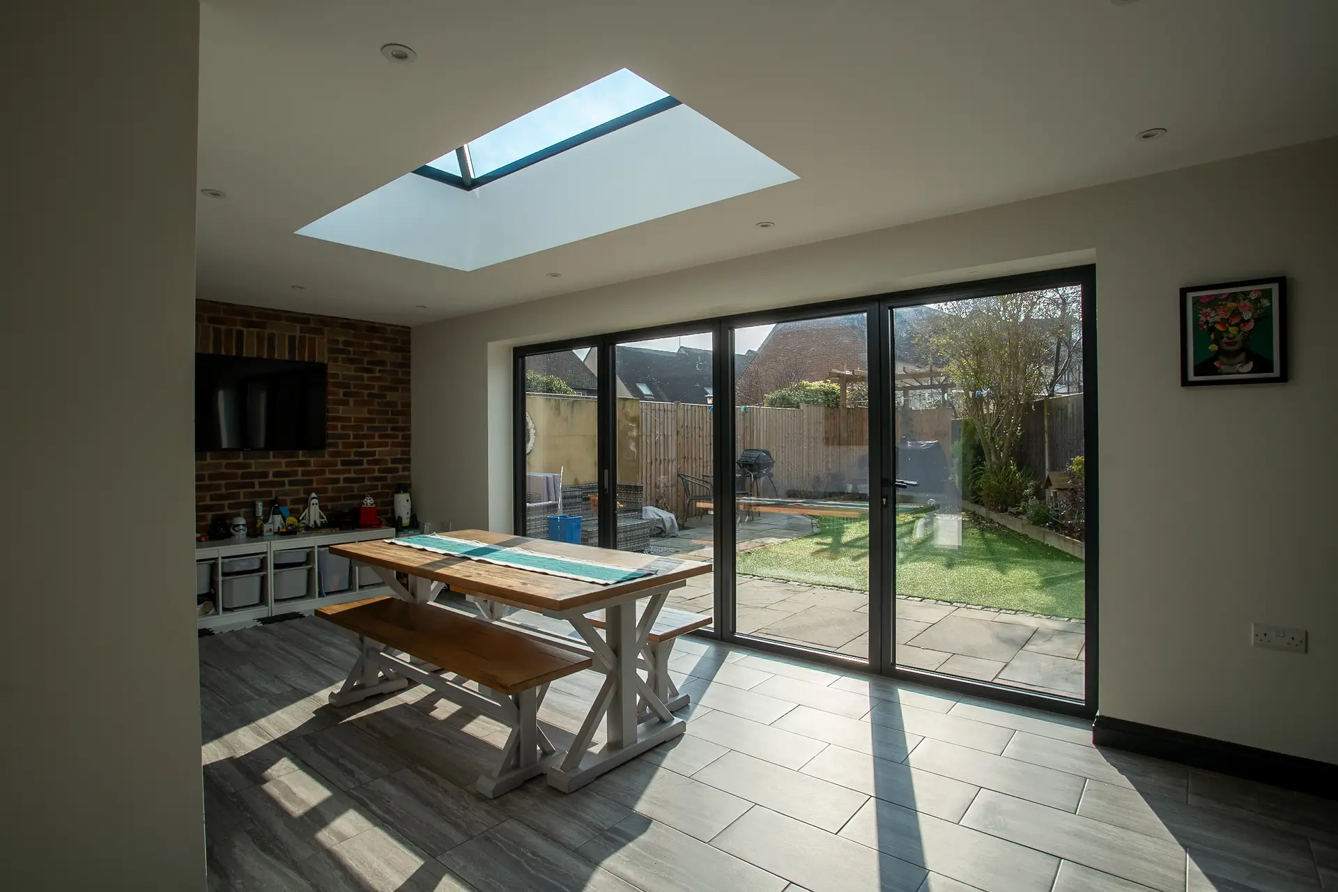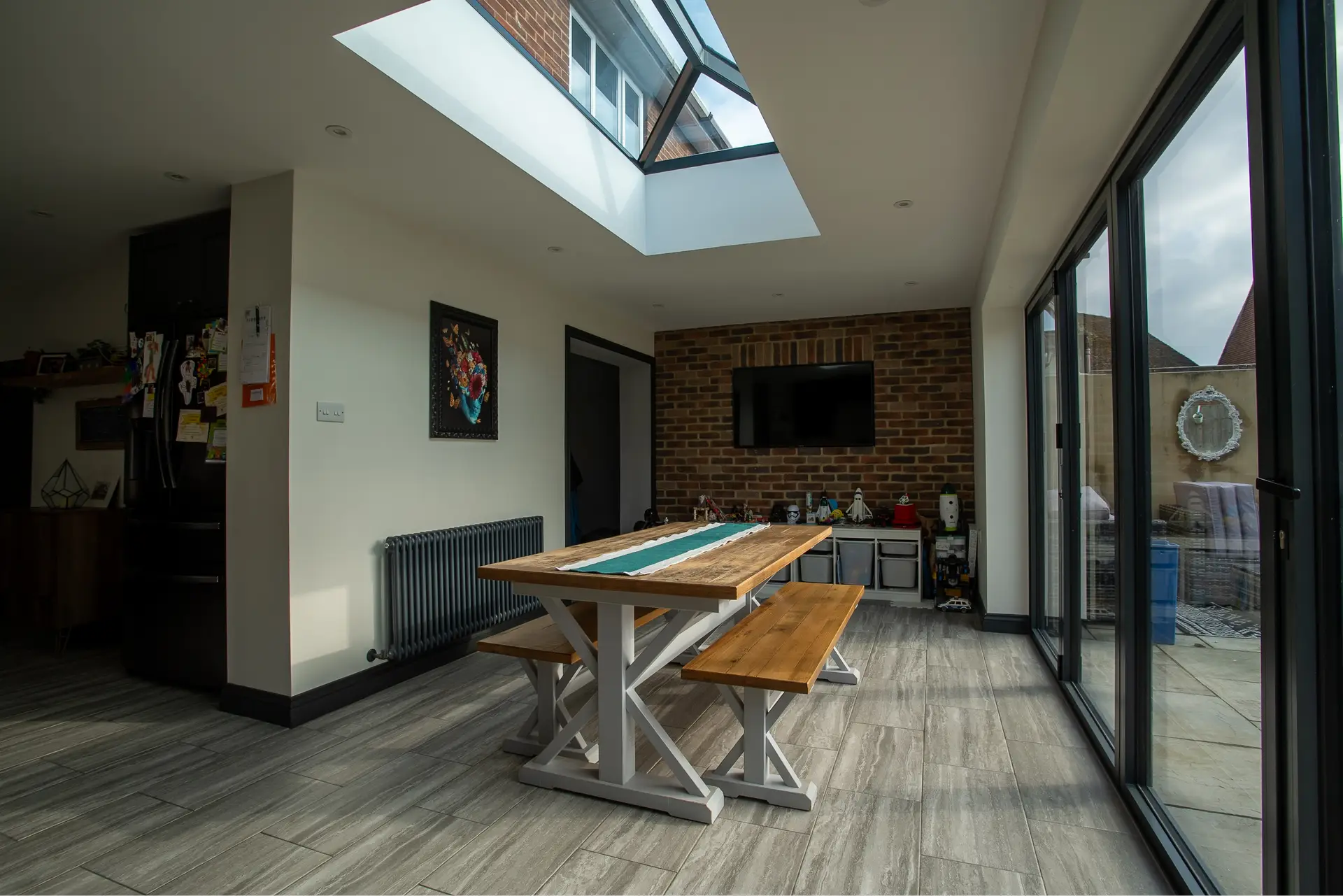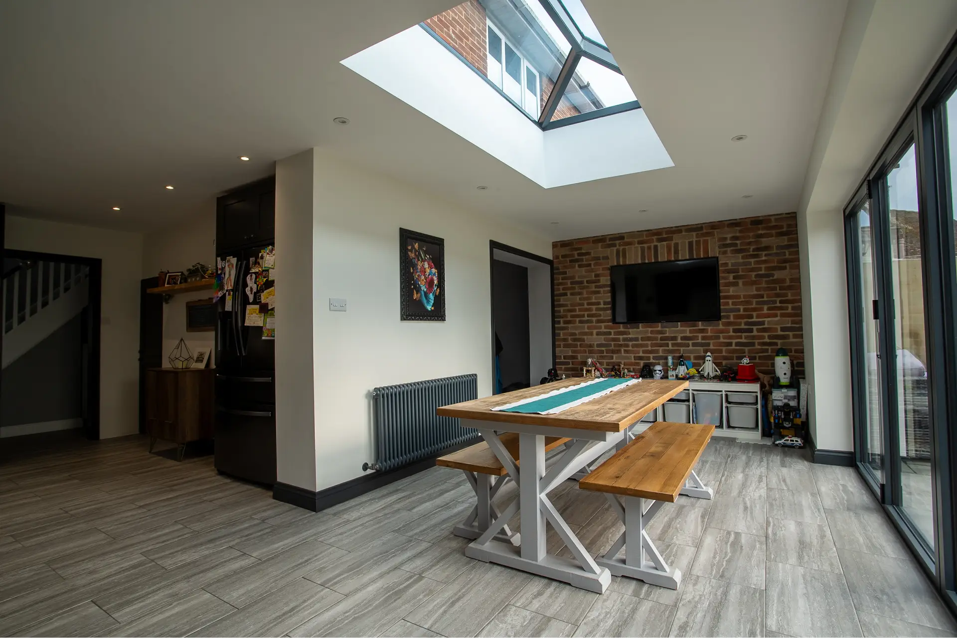 Brick Slips Feature Wall: One of the most eye-catching aspects of the extension is the feature wall adorned with brick slips around the TV area. This design choice adds texture and depth, creating a focal point that enhances the overall aesthetic of the room. The combination of the rustic brick slips with the modern features of the extension creates a harmonious blend of styles.