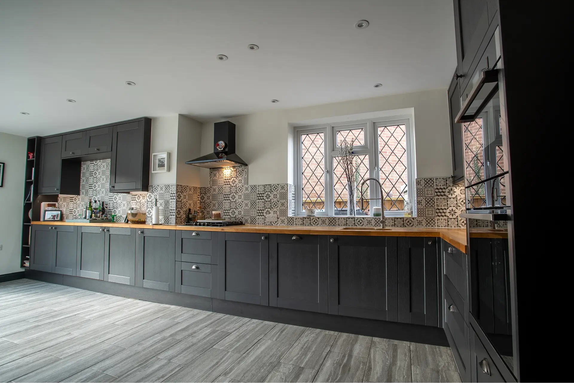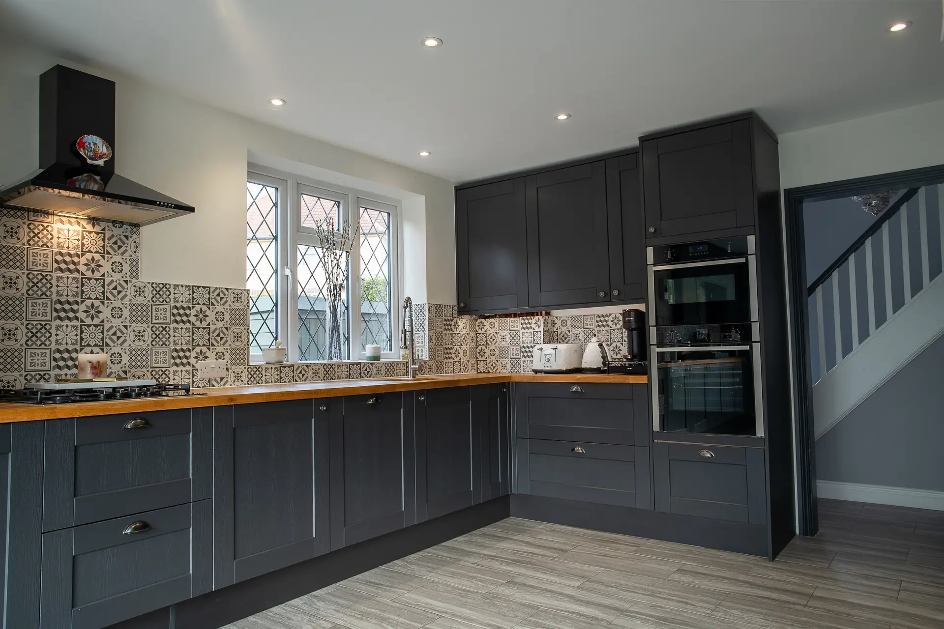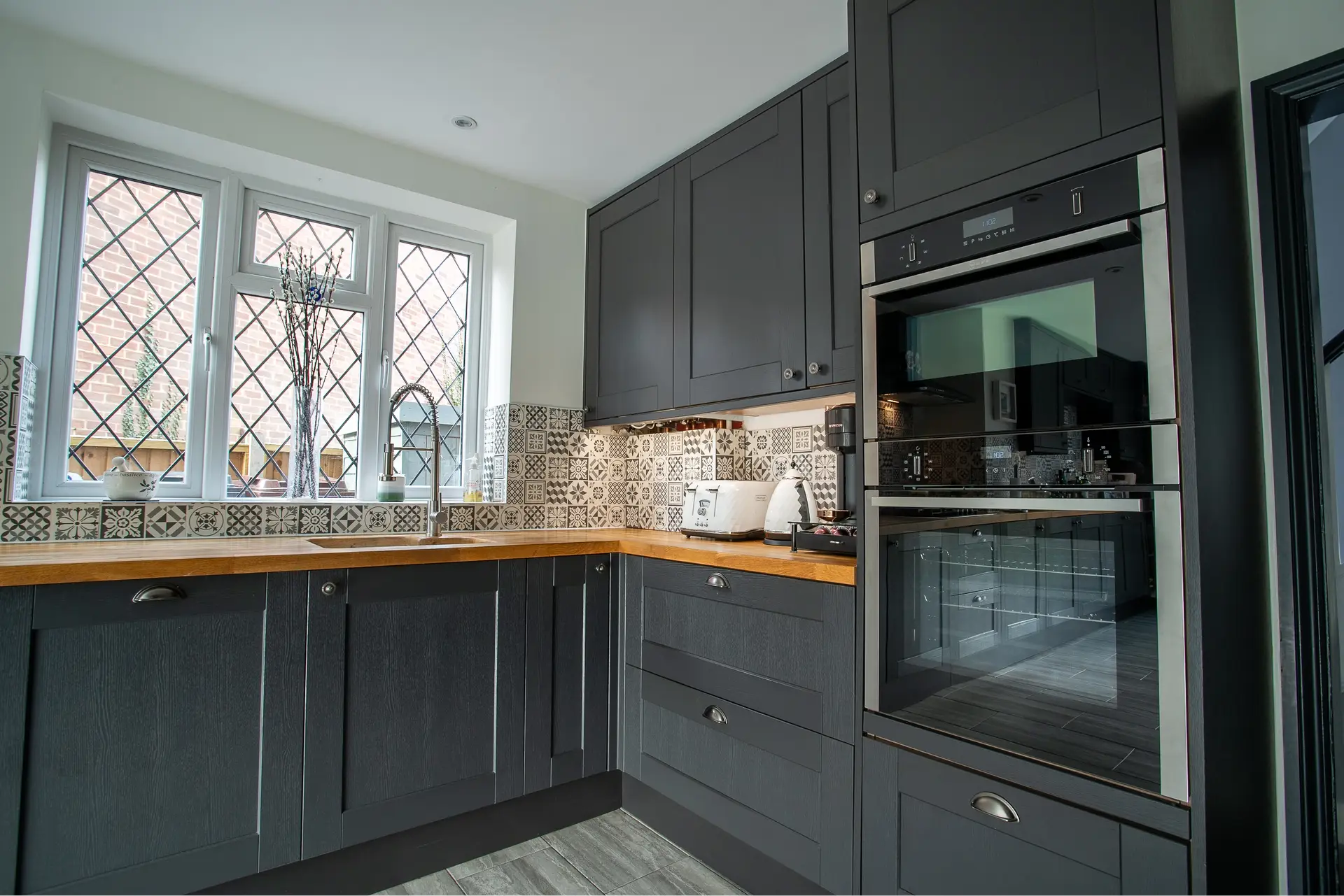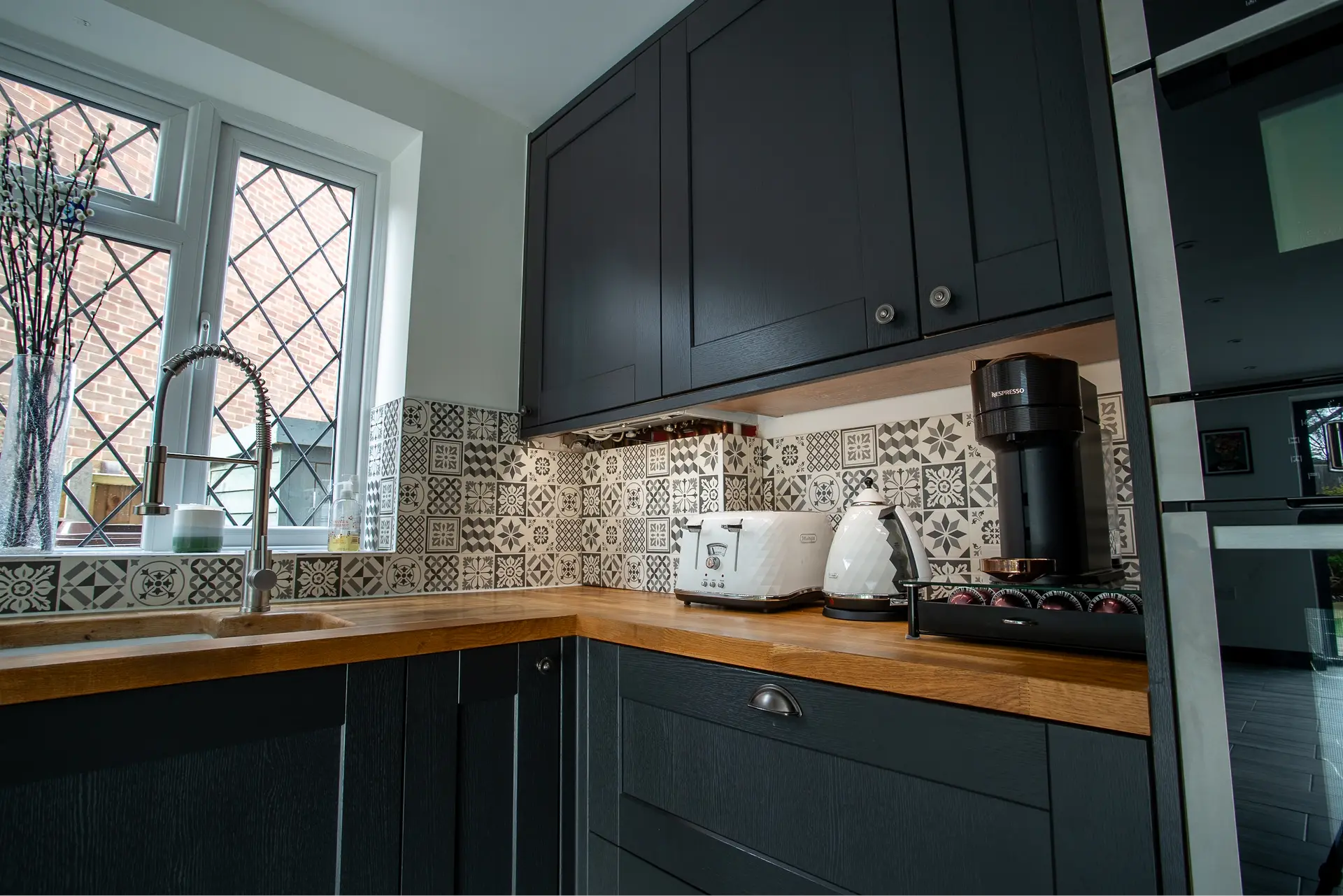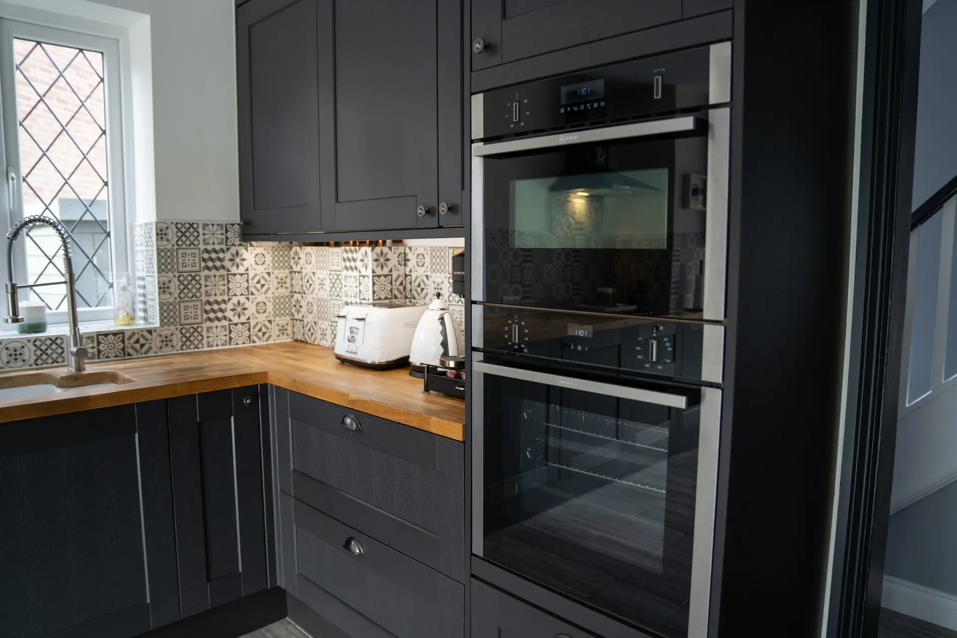 Oak Worktops: The use of oak worktops in the kitchen adds warmth and character to the space. The natural beauty of the wood creates a striking contrast with the modern design elements, providing both functionality and style.