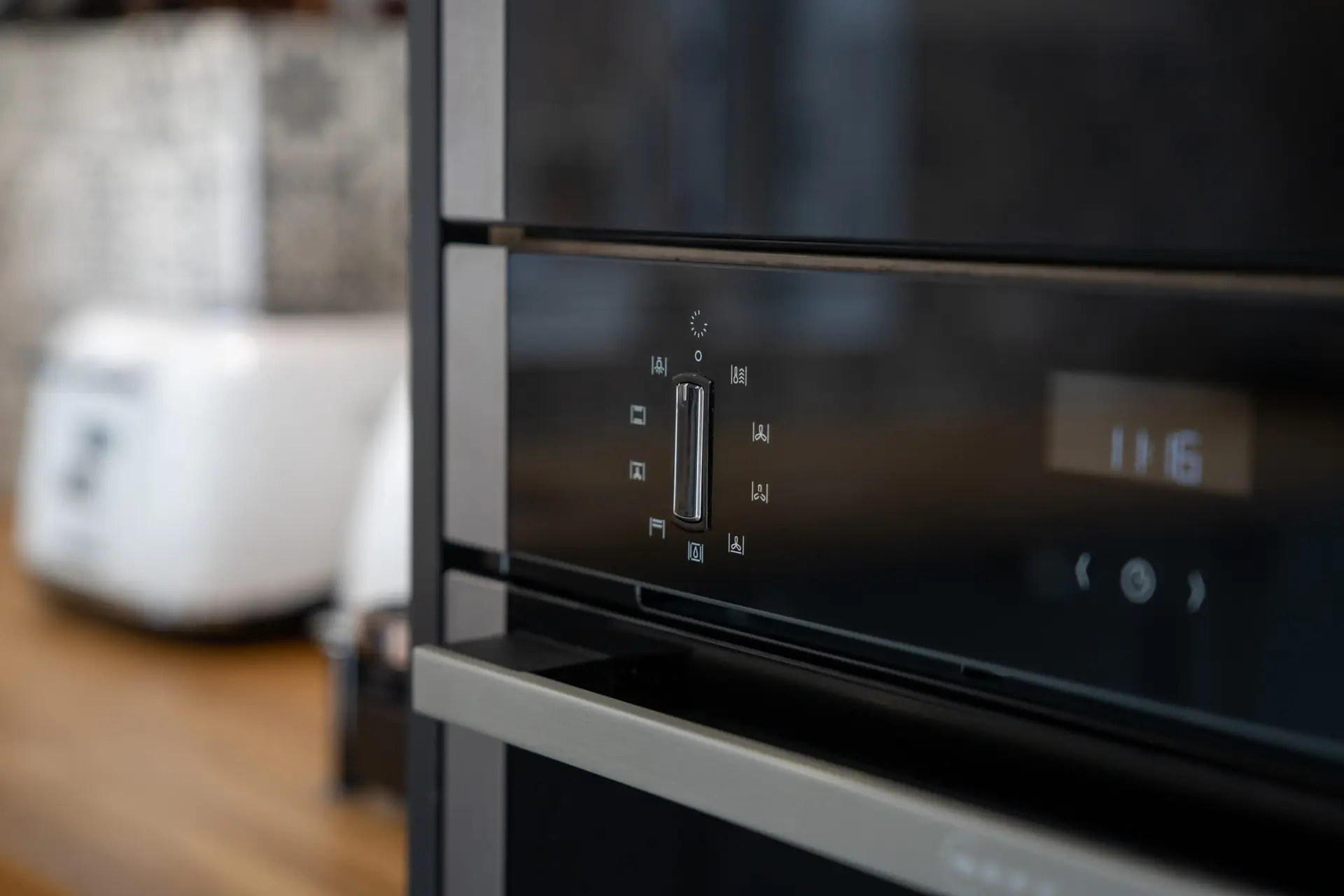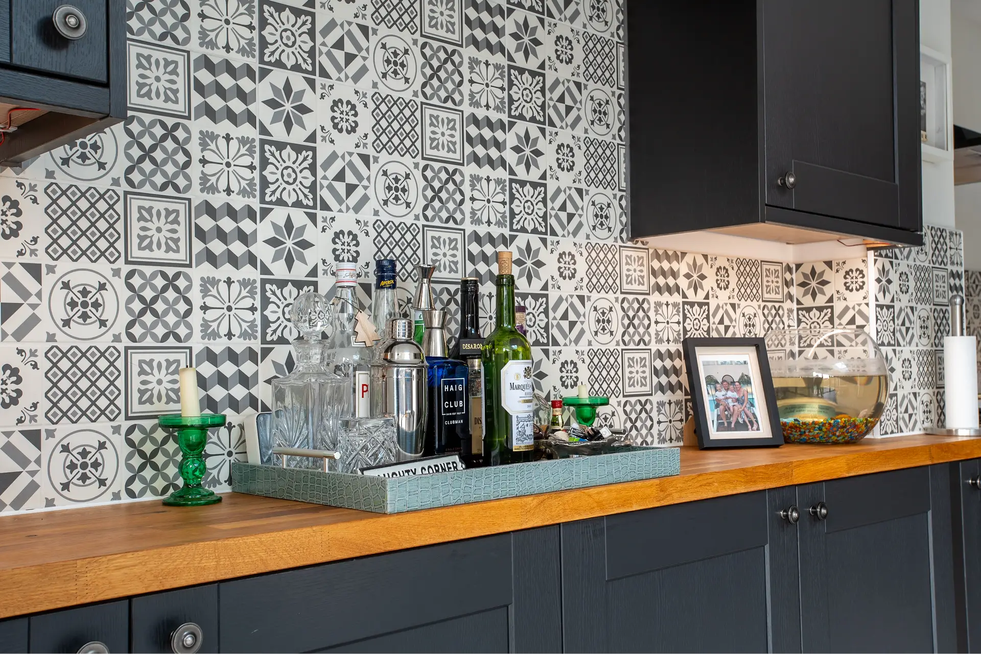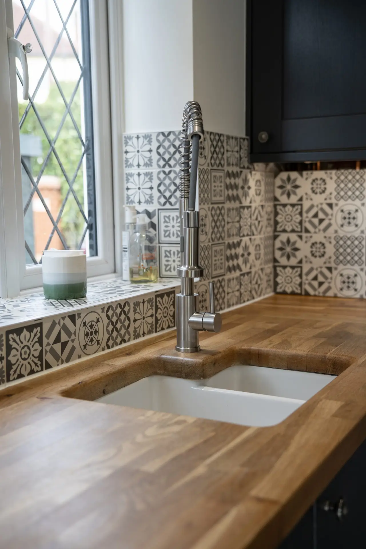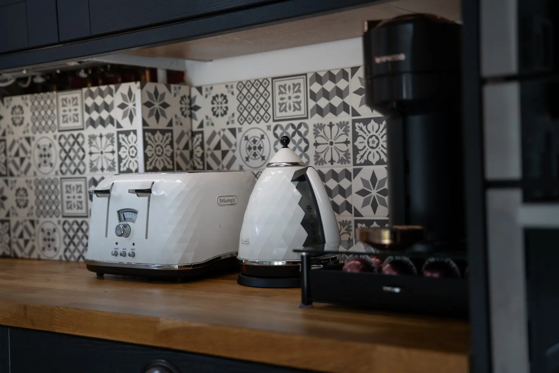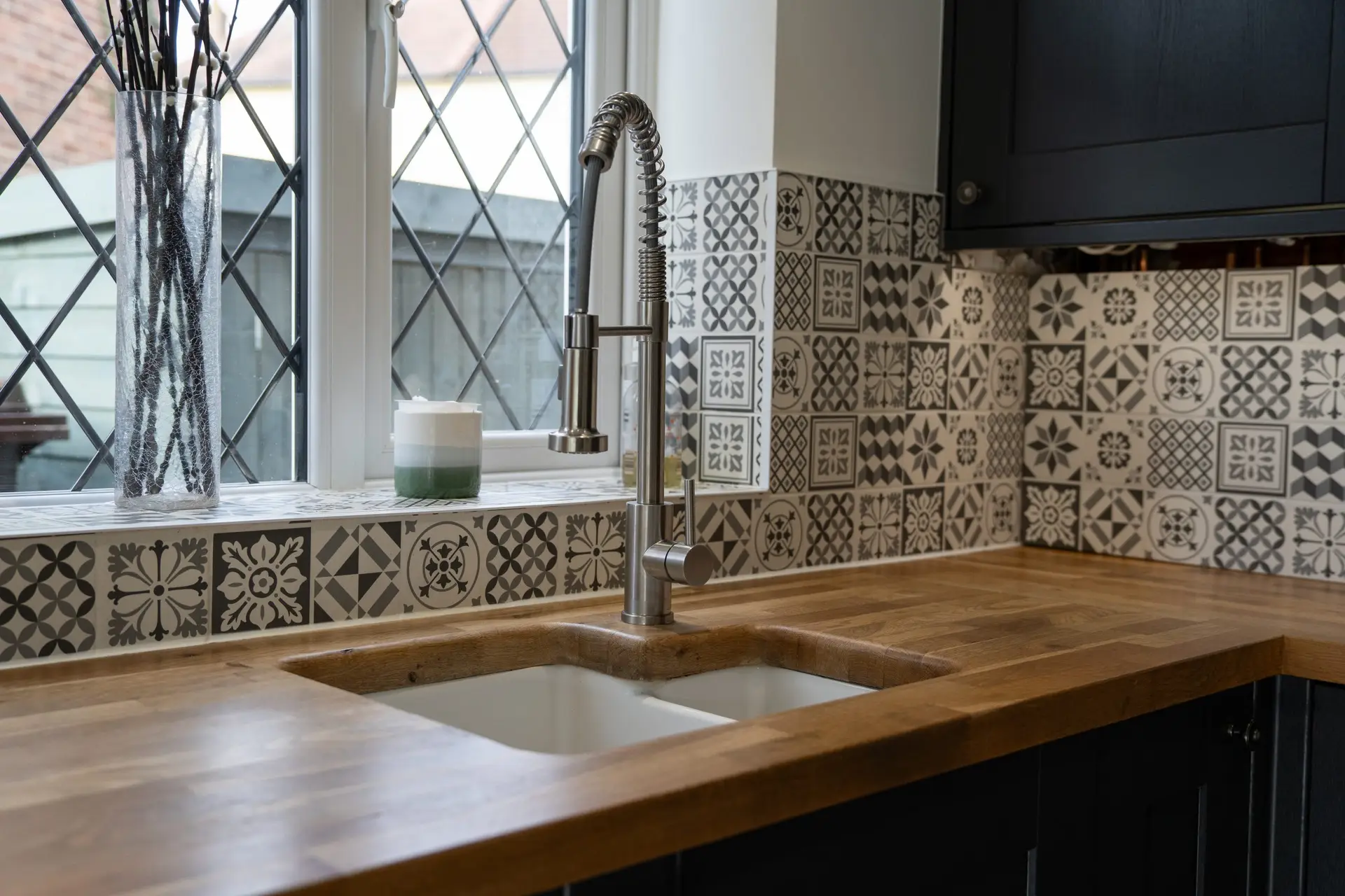 Oak Worktops: The use of oak worktops in the kitchen adds warmth and character to the space. The natural beauty of the wood creates a striking contrast with the modern design elements, providing both functionality and style.