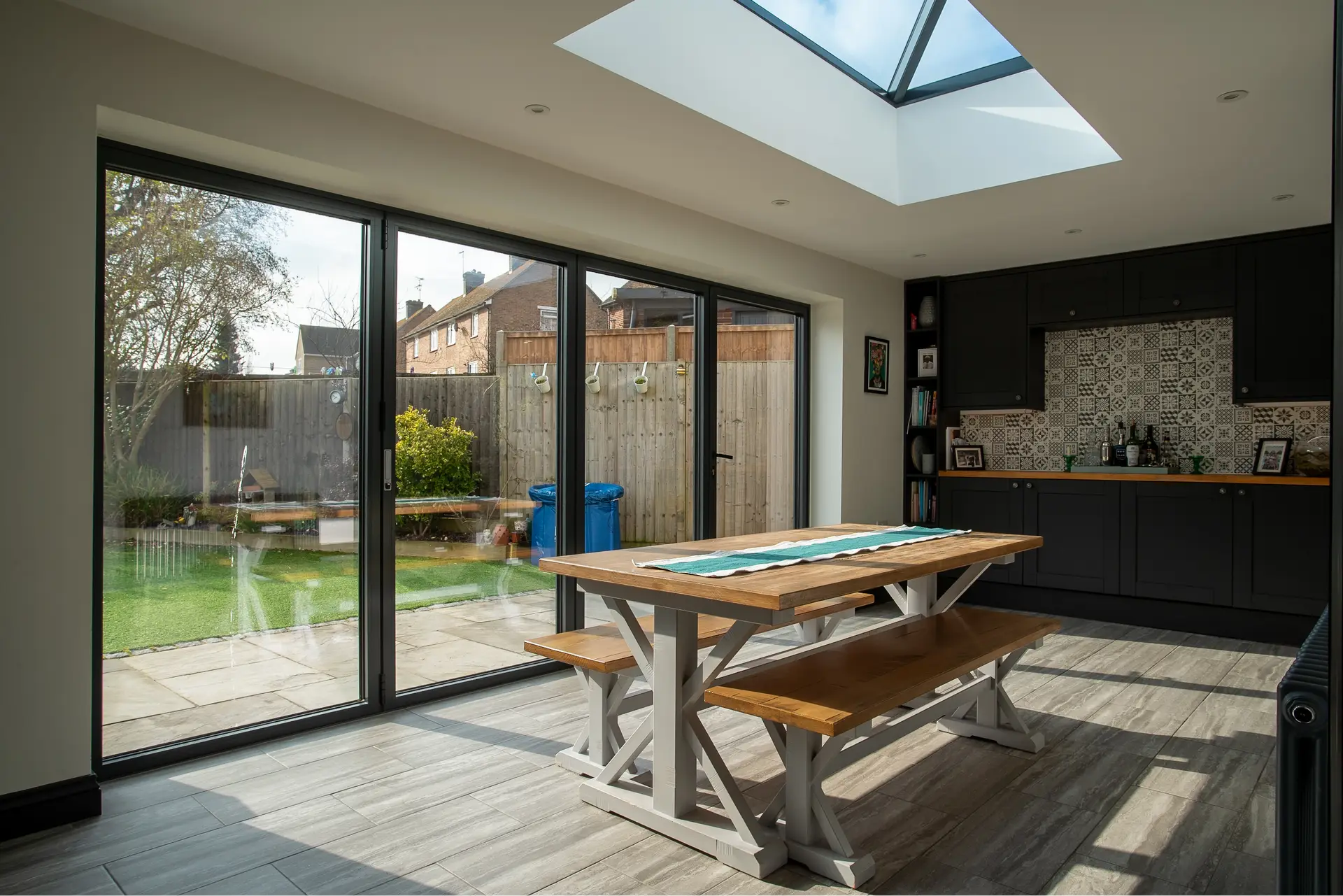 Large Bi-Fold Doors: The installation of large bi-fold doors allows for a seamless transition between the indoor and outdoor areas. When opened, these doors create a wide entrance that invites the outside in, perfect for summer gatherings or family barbecues.